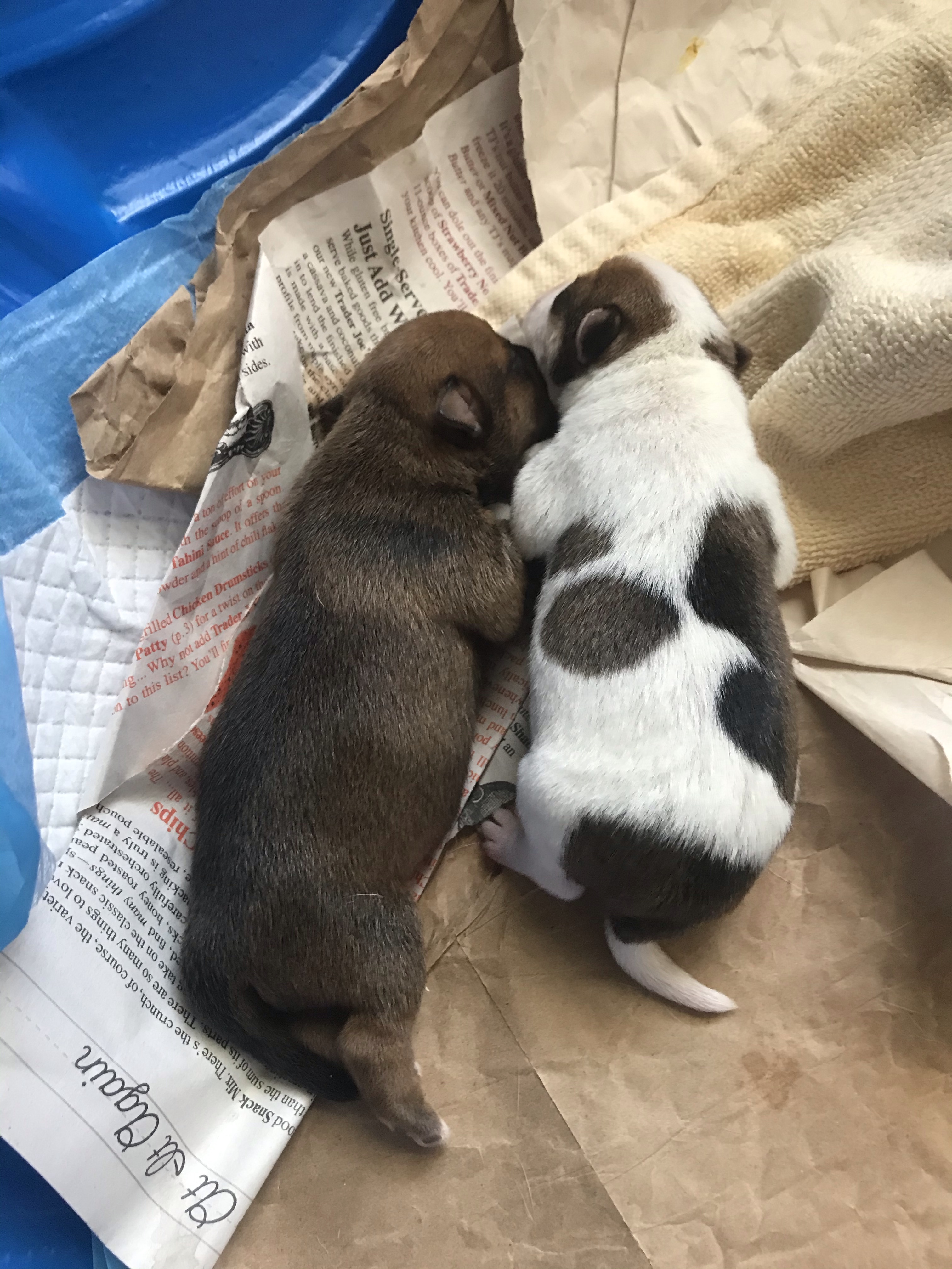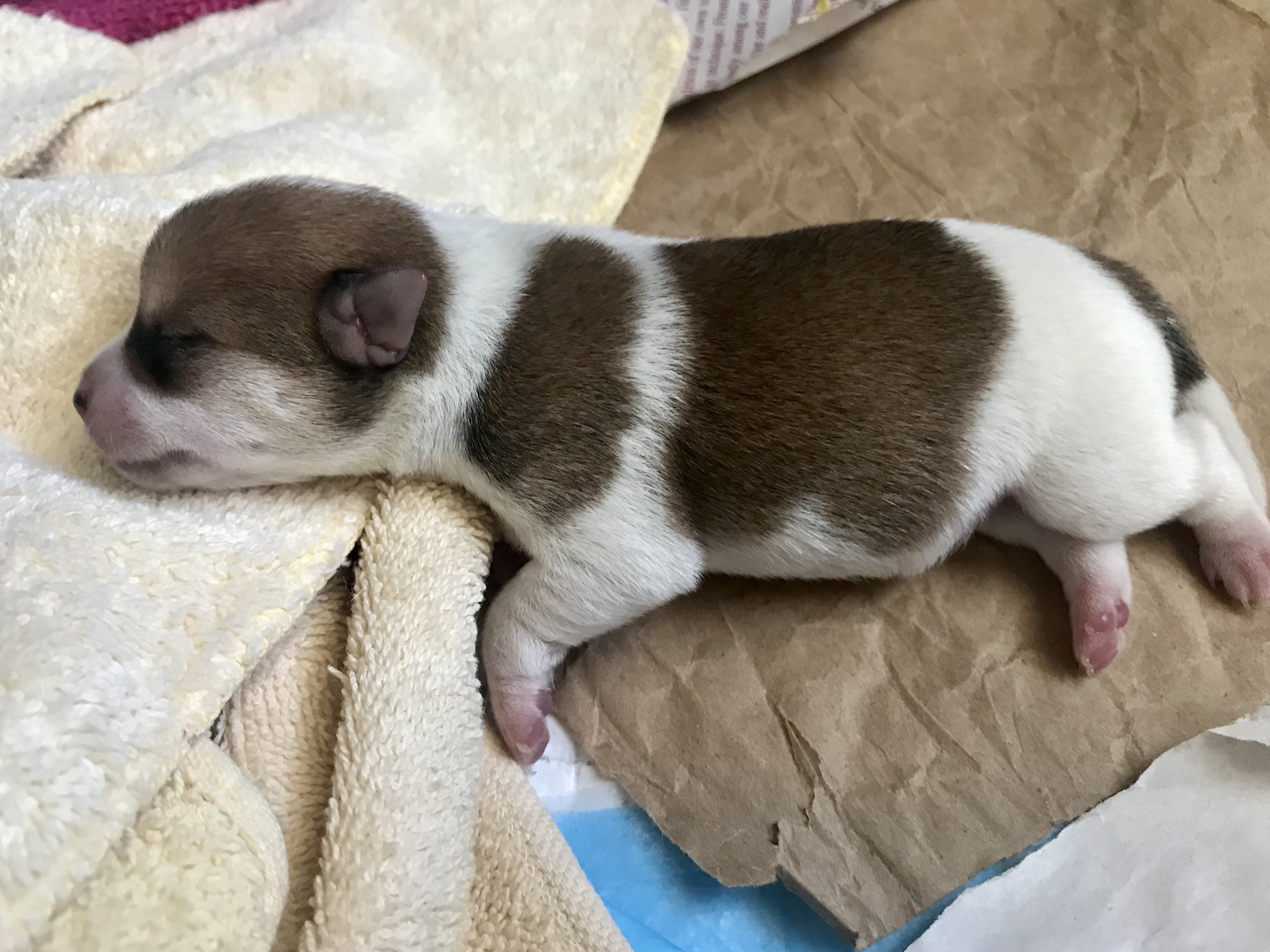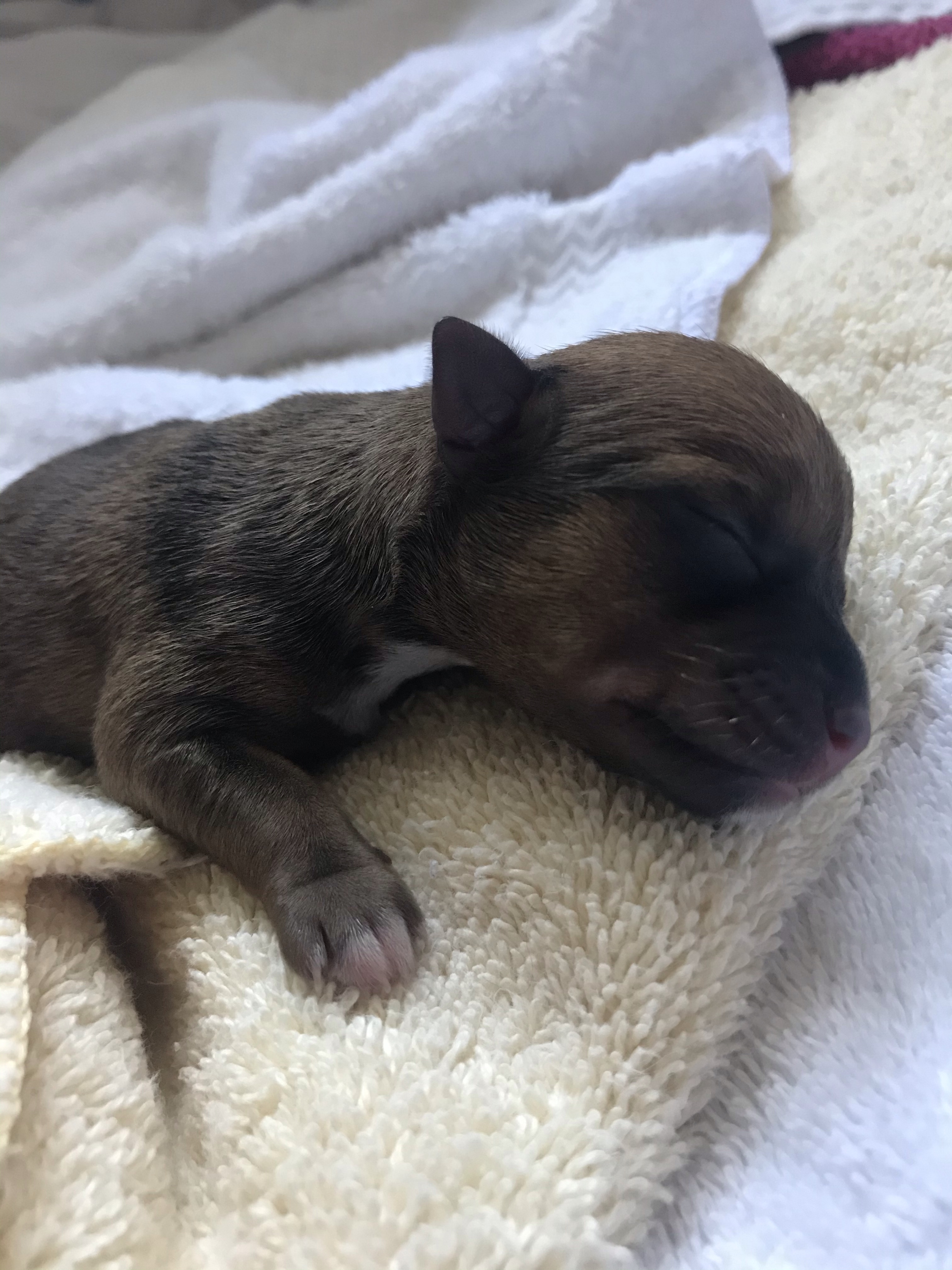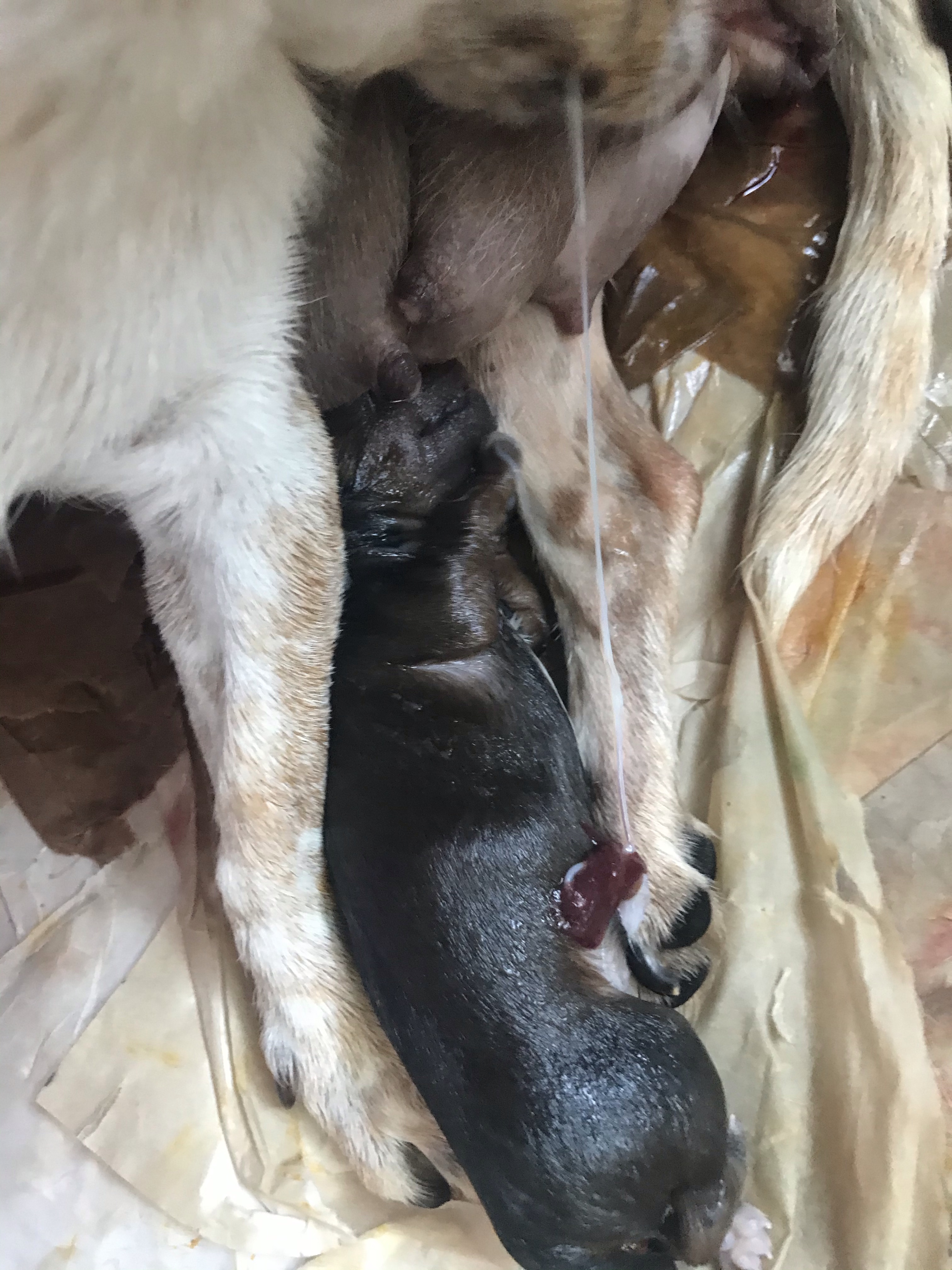 The first three puppies were born quite quickly. One after the other. A little space after the first, which was good considering that birth was rough (see Doggie Doula), but then the next two popped out easily. All three in about 25 minutes. All five in under an hour.