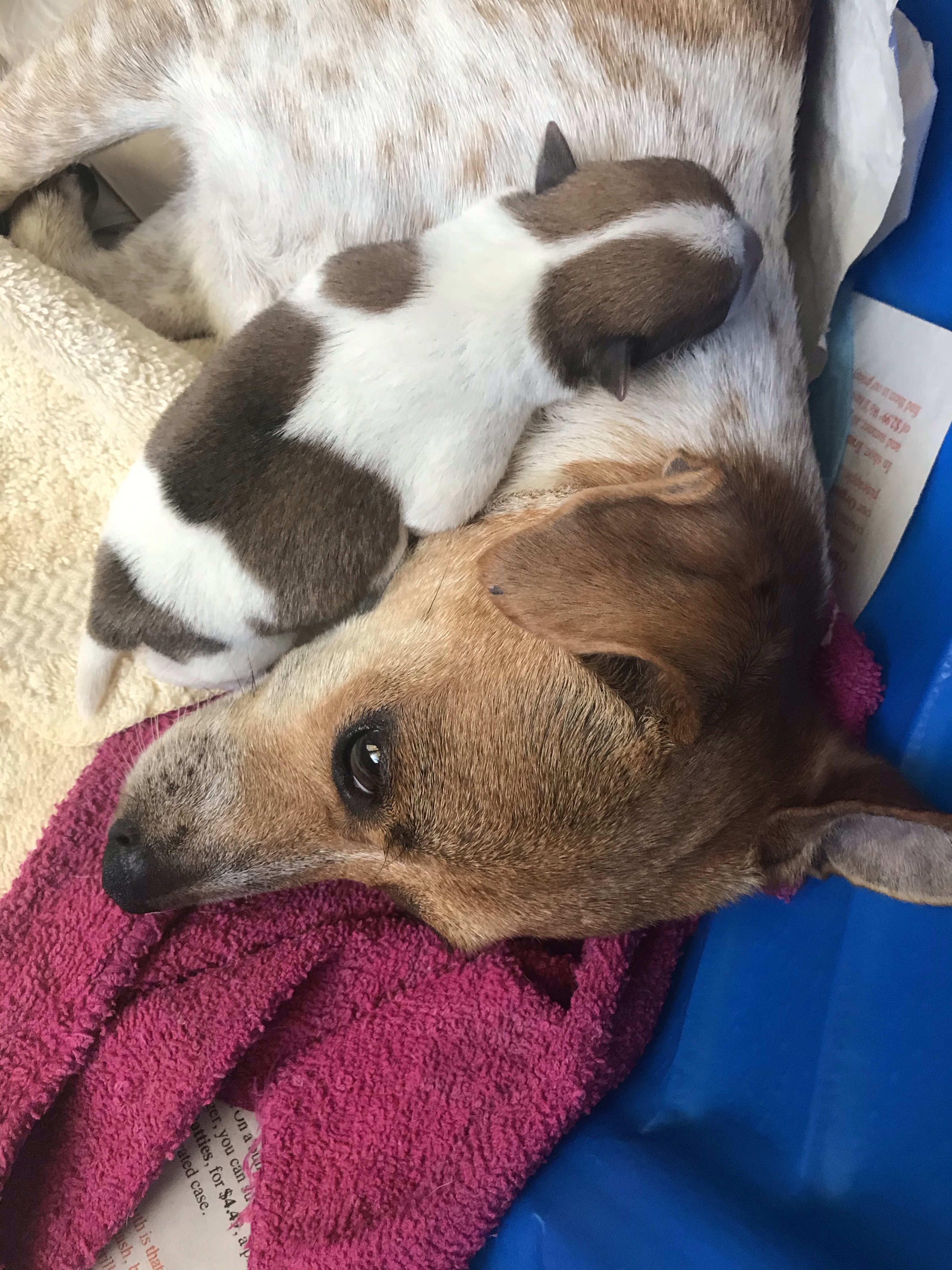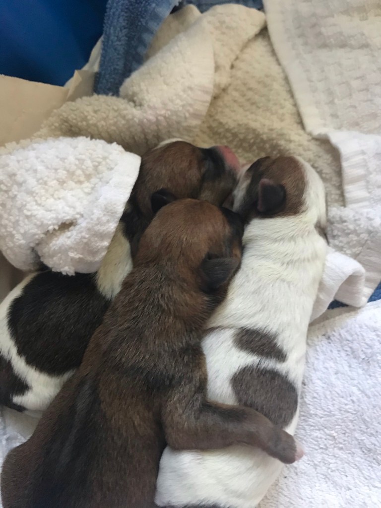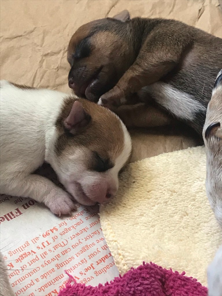 My new dog, Mazie, gave birth on Tuesday. Rescued from a hoarder with 91 other dogs, there was no telling who the father was or what they might look like. The only good news was that all the other dogs had been small, like her, so at least there wouldn’t be a crazy combination of breeds.
