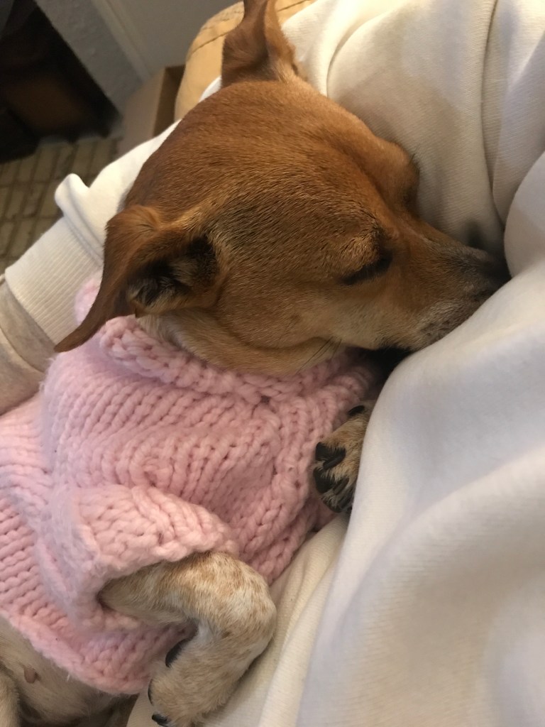 The point is, I would be devastated if something happened to her. She’s only 3.5 years old and I’m looking forward to another decade or more with her. I have really loved all my dogs (two of which are still kicking it at 14 years old in Idaho!) – and – there’s something about Mazie that takes my adoration to another level. I suspect some of this attachment has to do with her size. At twelve pounds, she is essentially the weight of an infant. And I tend to hold and cuddle her like one too.