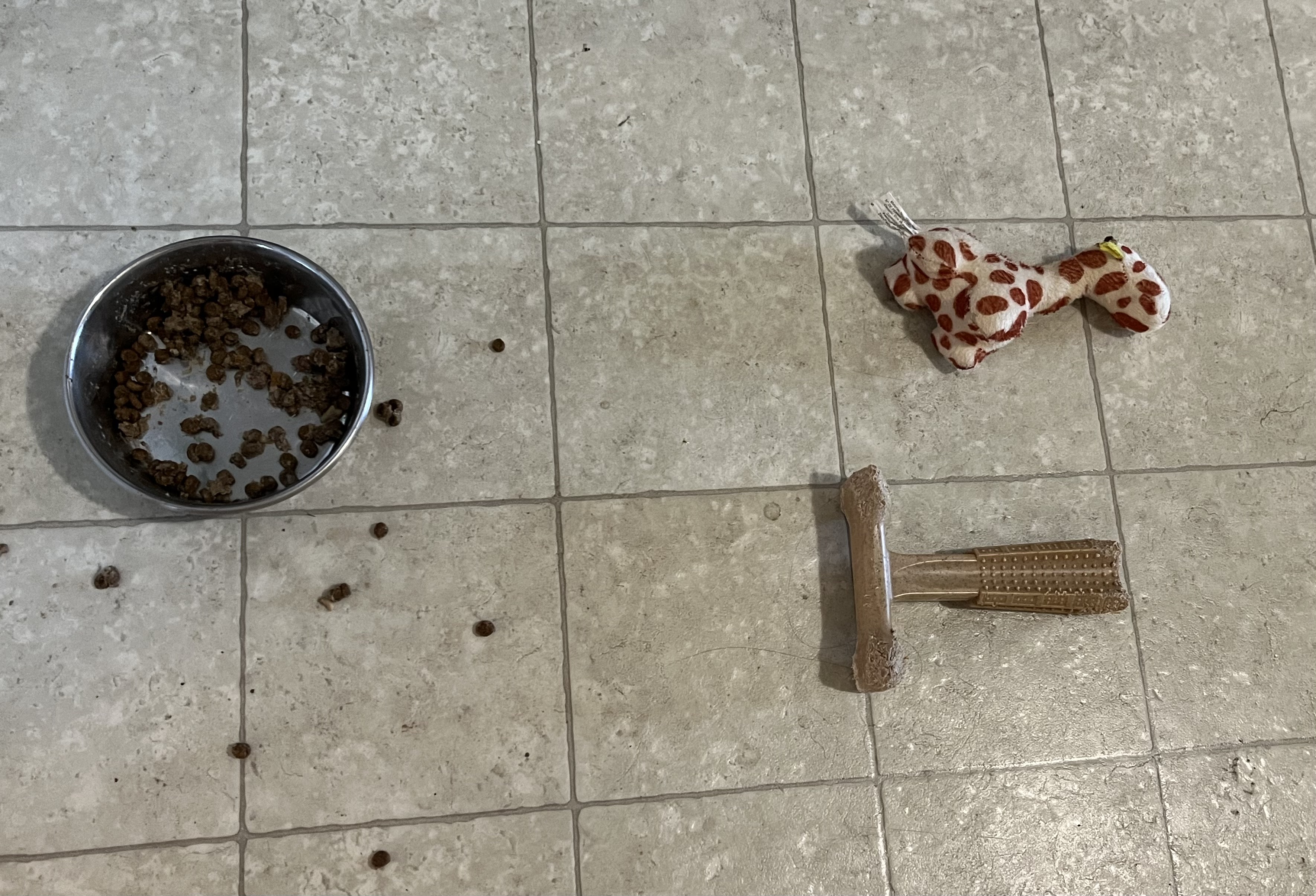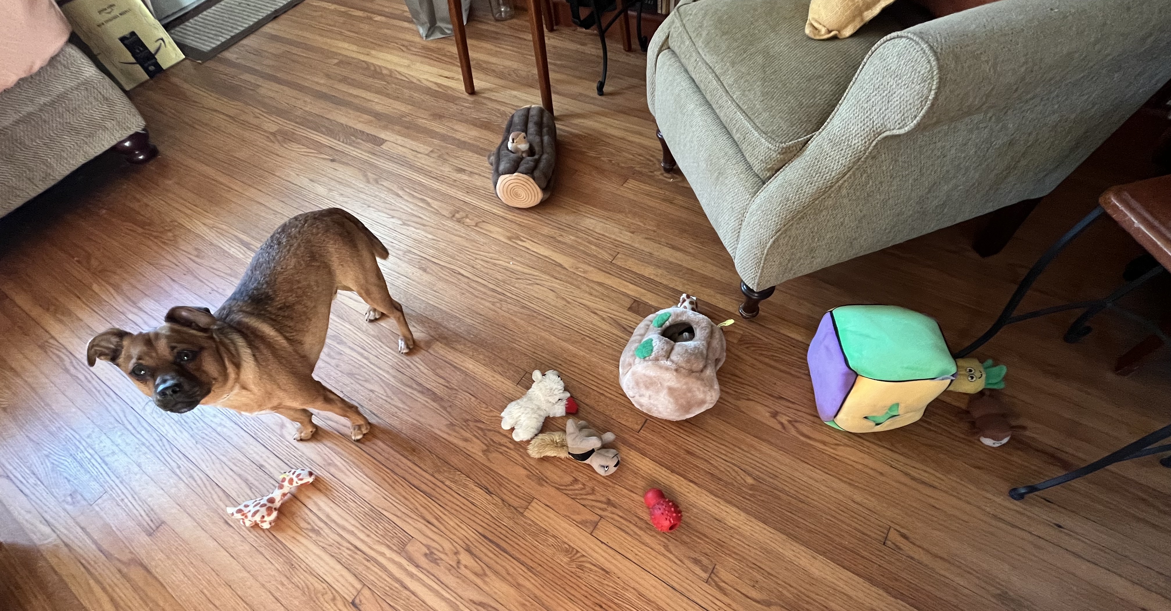 Dogs can make a mess of a home. At least twice a week, I gather up all of Mazie’s toys and dump them in a basket in order to vacuum, because even for a small dog, her hair is everywhere. Within hours, the toys are once again strewn across the floor. One of Mazie’s pups, Rupert, is her best friend and he stays with us frequently. Ru has a habit of taking a toy with him into every room. Into the kitchen, the bedroom, the hallway, the yard. It totally cracks me up. Somehow, I trained my other dogs to leave the kitchen when I say, “Out!” but not Rupert.