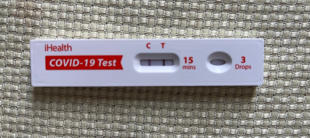 Mazie and I arrived on Tuesday. On Wednesday, Tom tested positive for Covid. I mean like, drop the fluid in the testing strip and within seconds, both lines are lit up. If strobe lights were an option, they would have been swirling. I, however, tested negative. Twice. Ah, but the third time…