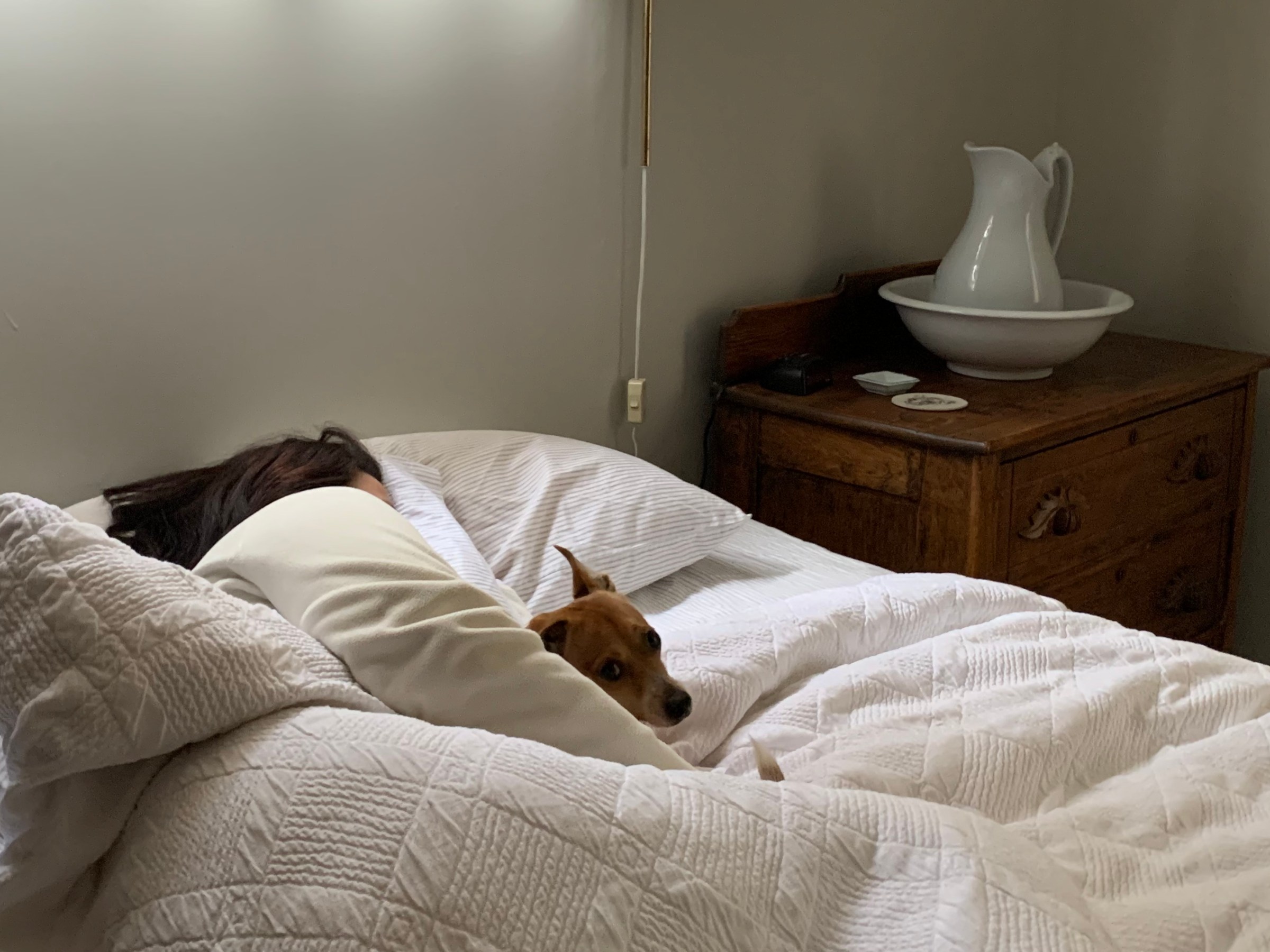 The TV isn’t working but we’ve had each other to talk to and amuse. And we have our dogs: Athena and Leo, both 14 and ½ years old and still sweet as ever, and little Mazie who never leaves my side. I’m grateful for big beds in adjoining rooms and warm down comforters. I’m grateful for Claudia who delivered our groceries.