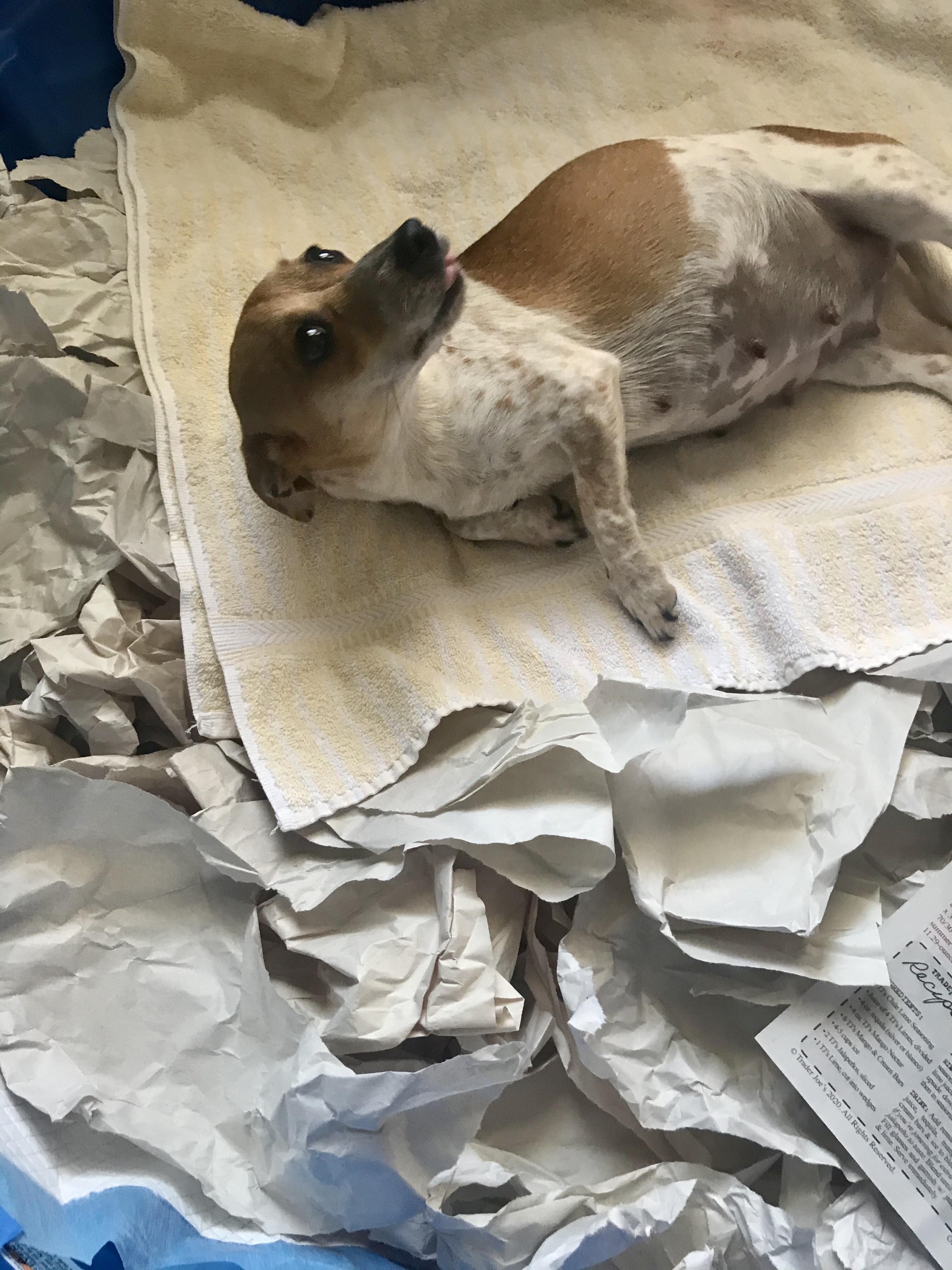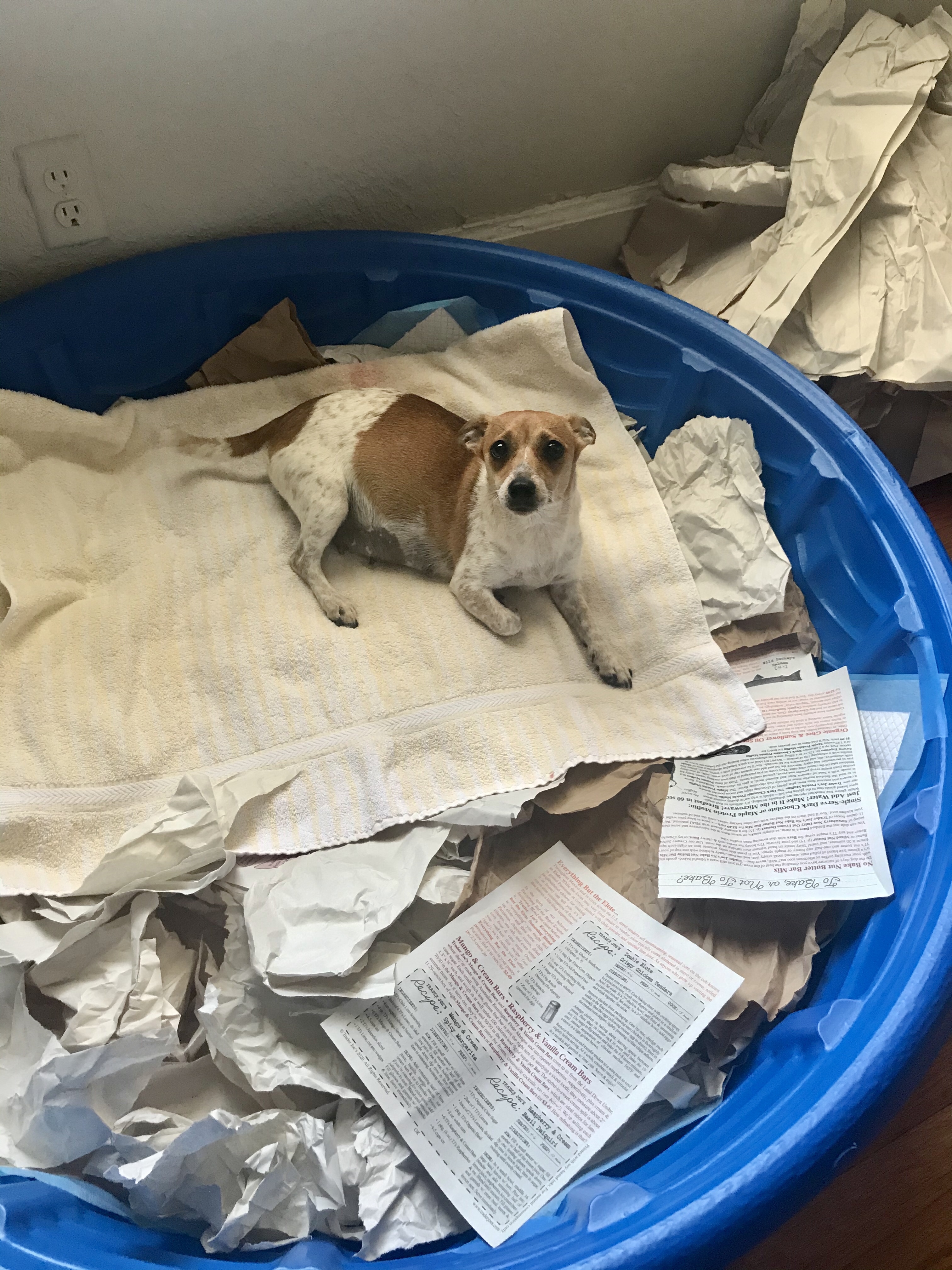 My new dog, Mazie, gave birth on Tuesday. Rescued from a hoarder with 91 other dogs, there was no telling who the father was or what they might look like. The only good news was that all the other dogs had been small, like her, so at least there wouldn’t be a crazy combination of breeds.